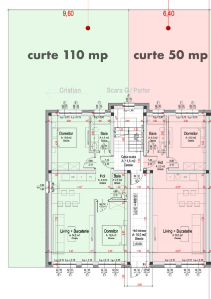 Compartimentare apartament cu 2 camere: Living + bucătărie = 30 mp Dormitor = 13 mp., Baie = 4,5 mp., hol = 2,2 mp. parter curte = 50 mp