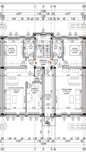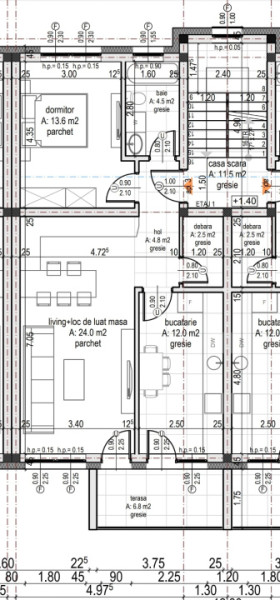 Compartimentare apartament cu 3 camere: Living + bucătărie = 24 mp Dormitor = 12 mp Dormitor = 13,6 mp Baie = 4,5 mp WC sericiu = 2,5 mp hol = 4,8 mp. La parter curte = 50 mp iar la etaj terasa de 6,8 mp.