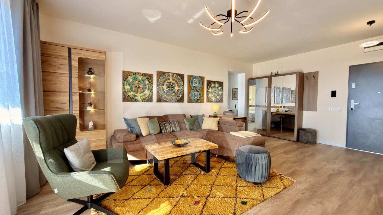 Încă de la intrare se simte atenția pentru detalii. Spațiul este generos și armonios, iar livingul open-space cu bucătăria complet utilată creează un ambient modern și primitor. Finisajele în tonuri calde, mobilierul ales cu grijă și lumina naturală abundentă conturează o atmosferă relaxantă, perfectă pentru momentele petrecute acasă.