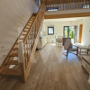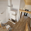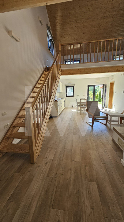 Living luminos, bucătărie open space, cu vedere către zona mansardată