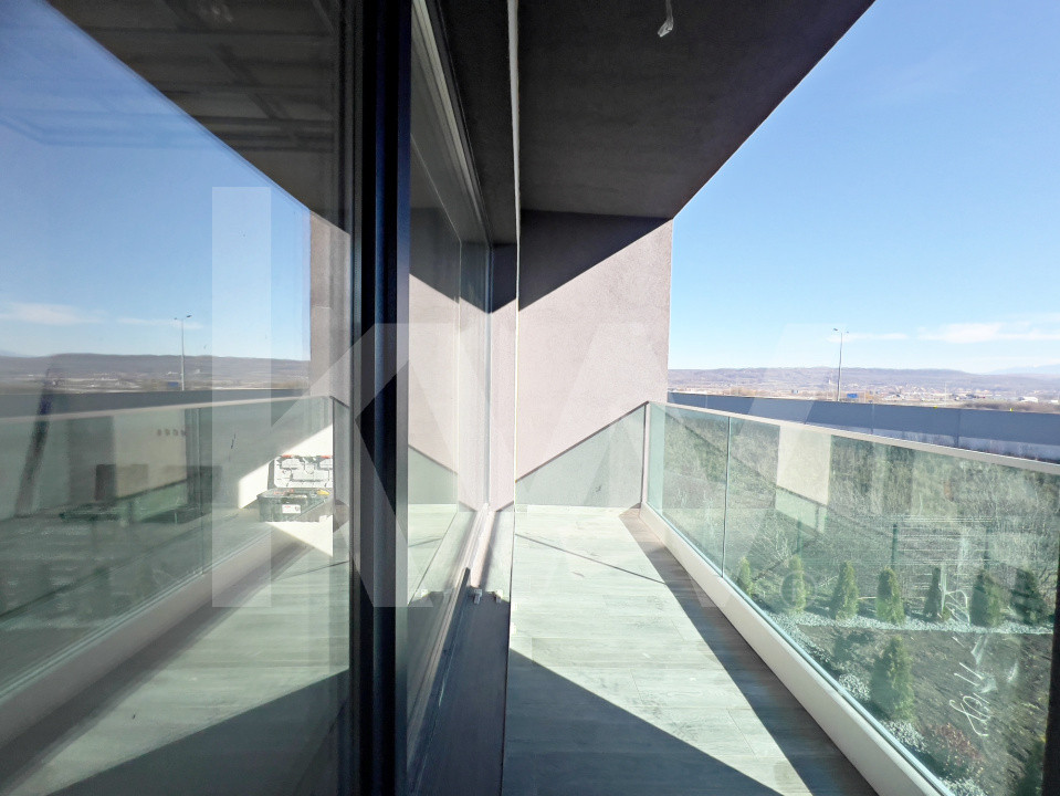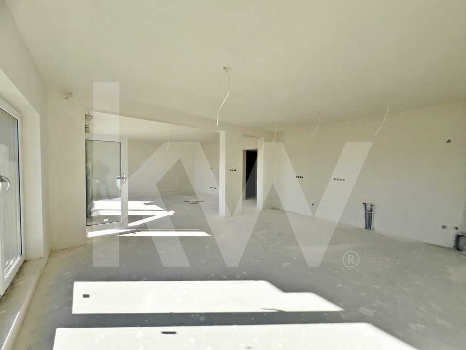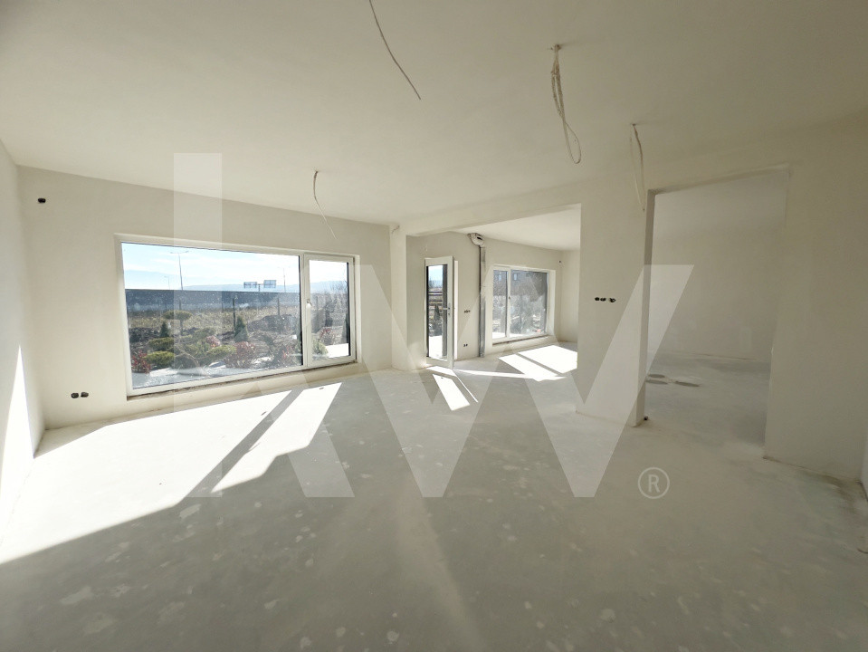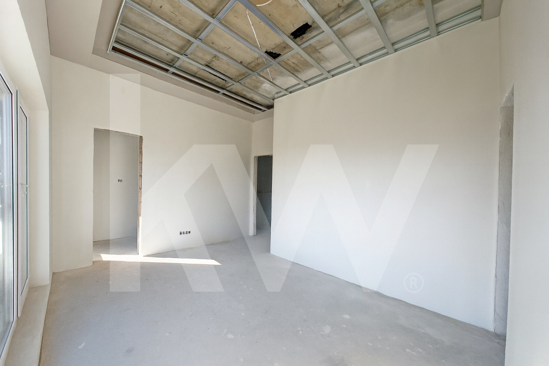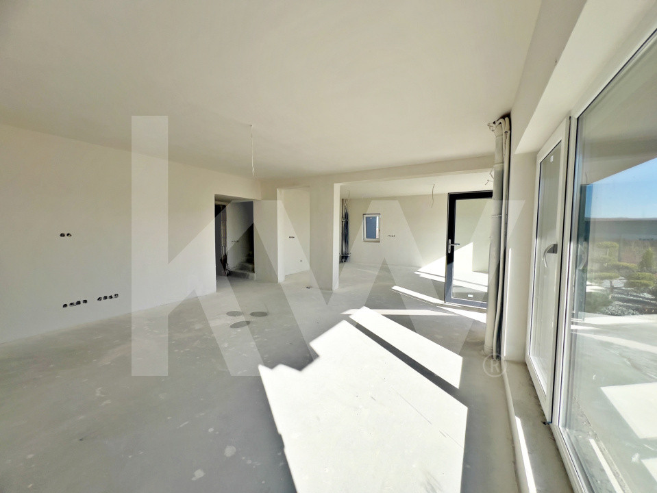 Parterul e dominat de un living luminos (30,5 mp) cu acces la terasă, o bucătărie spațioasă (27,1 mp), baie, spațiu tehnic, debara și un garaj generos (36,5 mp). La nevoie, acesta poate fi transformat într-un apartament tip studio, complet separat.